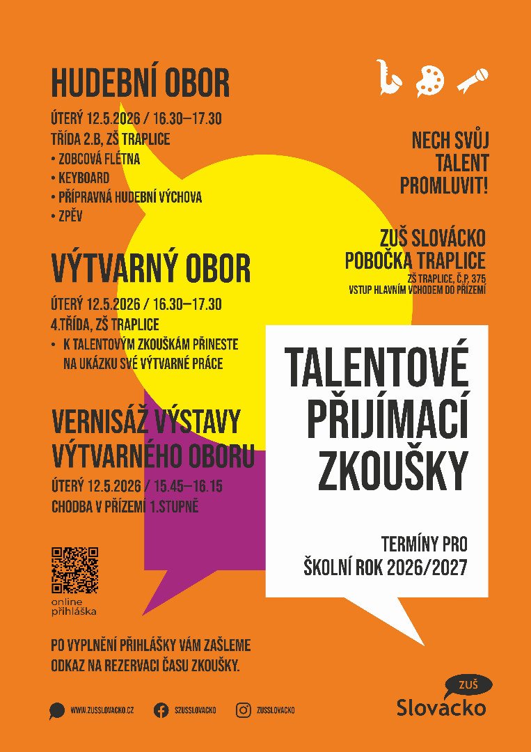 Hledáte‑li pro své dítě kreativní prostředí, v němž se bude dobře cítit a s radostí objevovat svět umění, kde se uplatňují současné vyučovací trendy i technika, neváhejte a vyplňte online přihlášku k talentovým zkouškám ZUŠ Slovácko na pobočku v Traplicích. Žáky přijímáme na základě talentových zkoušek do výtvarného oboru a hudebního oboru (zobcová flétna, keyboard, zpěv, přípravná hudební výchova). Nemusíte se bát, zkoušky probíhají hravou a vstřícnou formou.